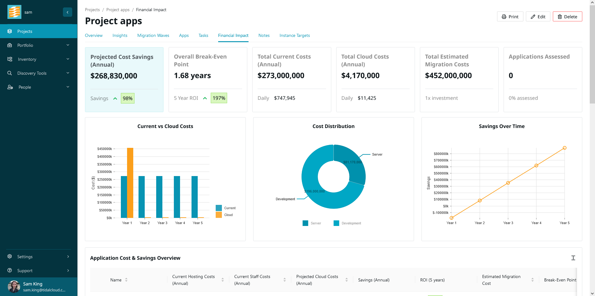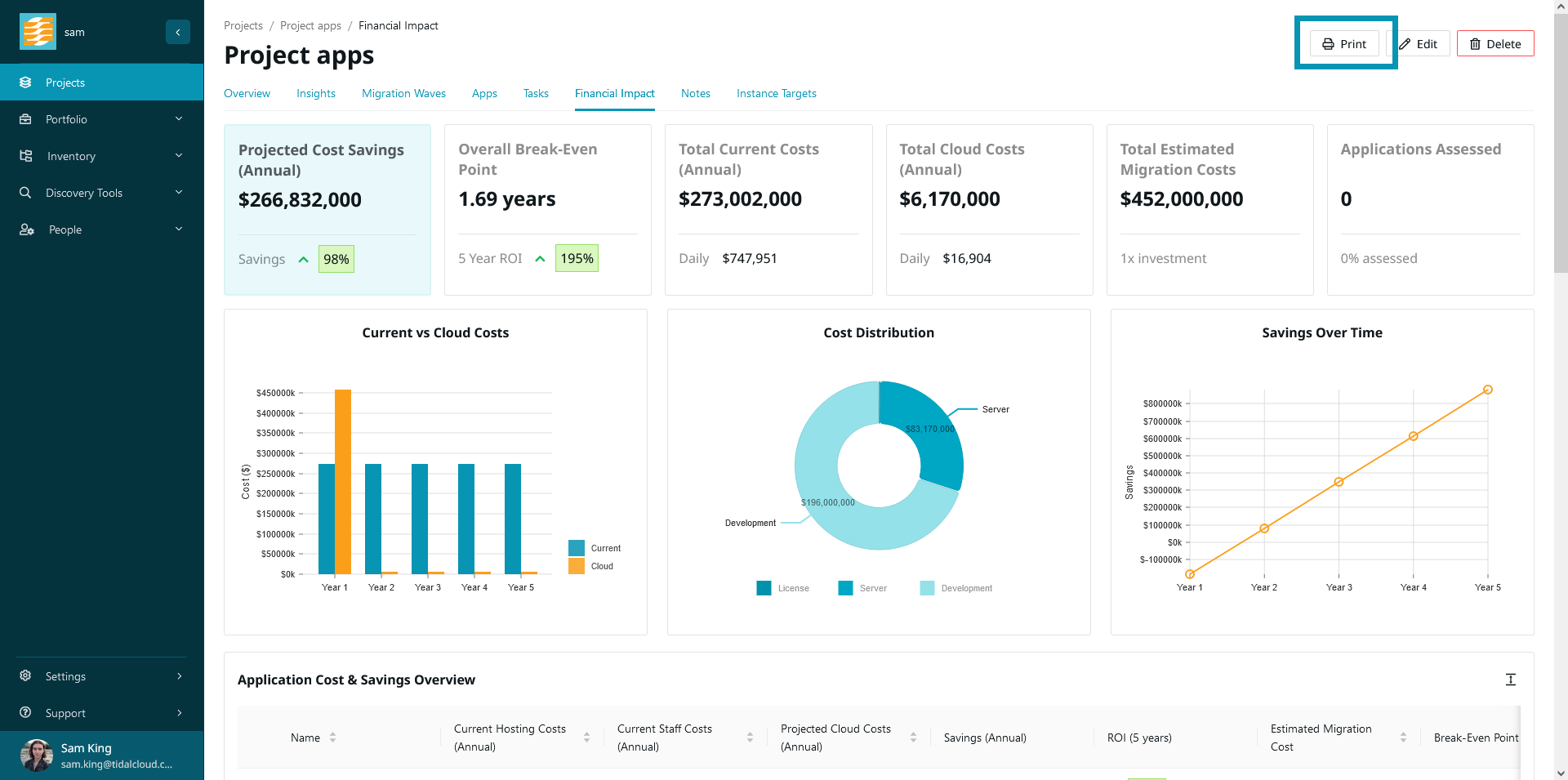 To print the financial impact report for your project, simply click the ‘Print’ button shown below and we will generate a printable report for you. This can be used for deliverables or shared with stakeholders to reinforce your cloud migration business case.